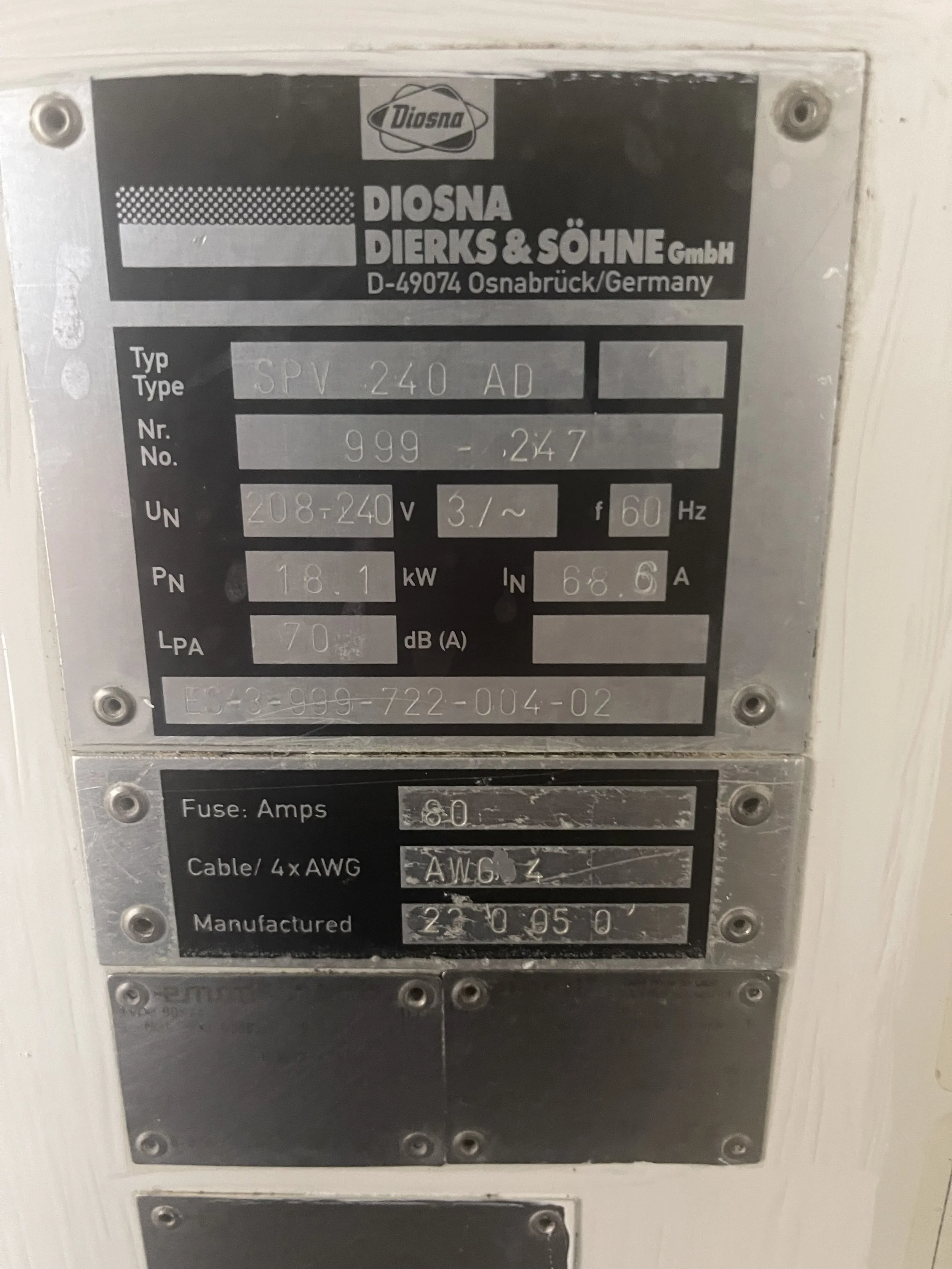 Verification confirms the presence, installation, and operational readiness of the Diosna SPV 240 AD mixer, including manufacturer plate data, electrical configuration, and control interface.
