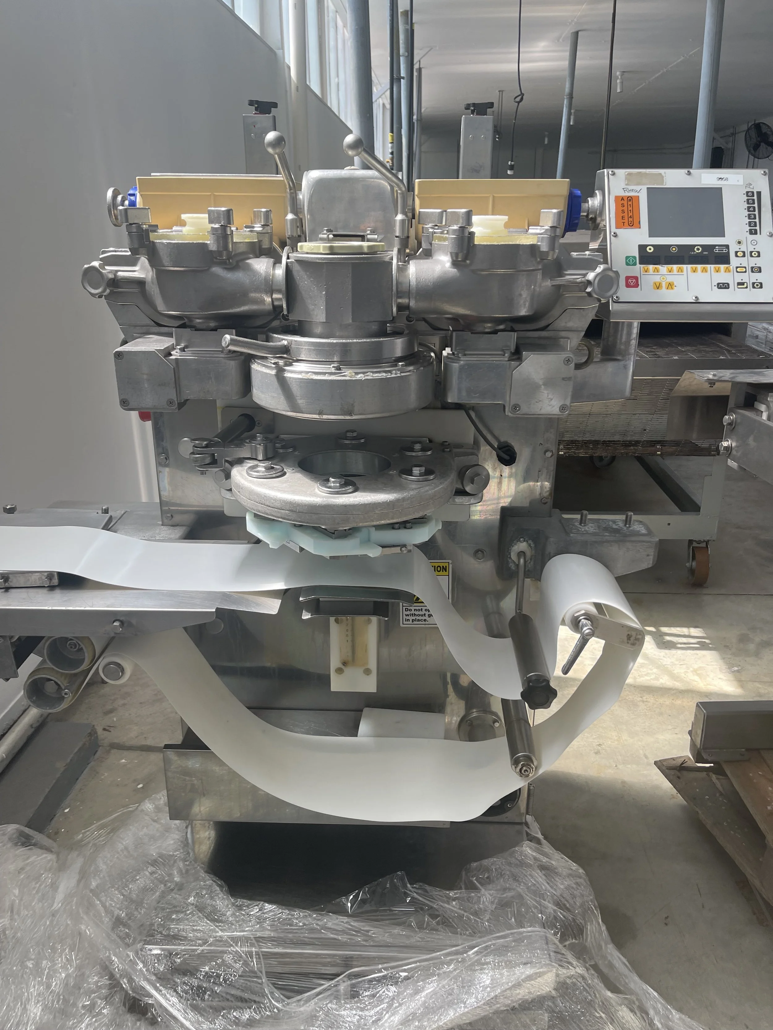 The Rheon KN550 Cornucopia Forming System is an automated food forming and portioning machine designed for continuous production of filled or shaped food products within a commercial manufacturing environment. The system is configured to portion and form dough-based or composite food products and is utilized in this application as a “cup drop” system for forming product bases used in pot pie production.