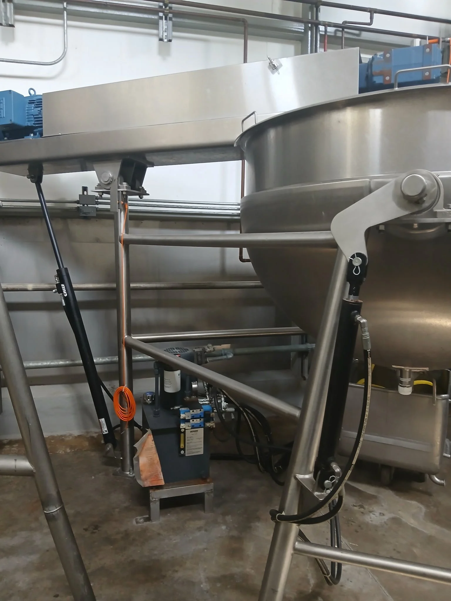 Unit observed installed within kettle room and configured for production use. Equipment appears complete with vessel, hydraulic tilt system, agitation drive housing, and control interface. No manufacturer nameplate observed at time of documentation. Configuration and construction are consistent with industrial steam-jacketed tilting kettle systems used in commercial food processing. Overall condition consistent with maintained, operational production equipment.