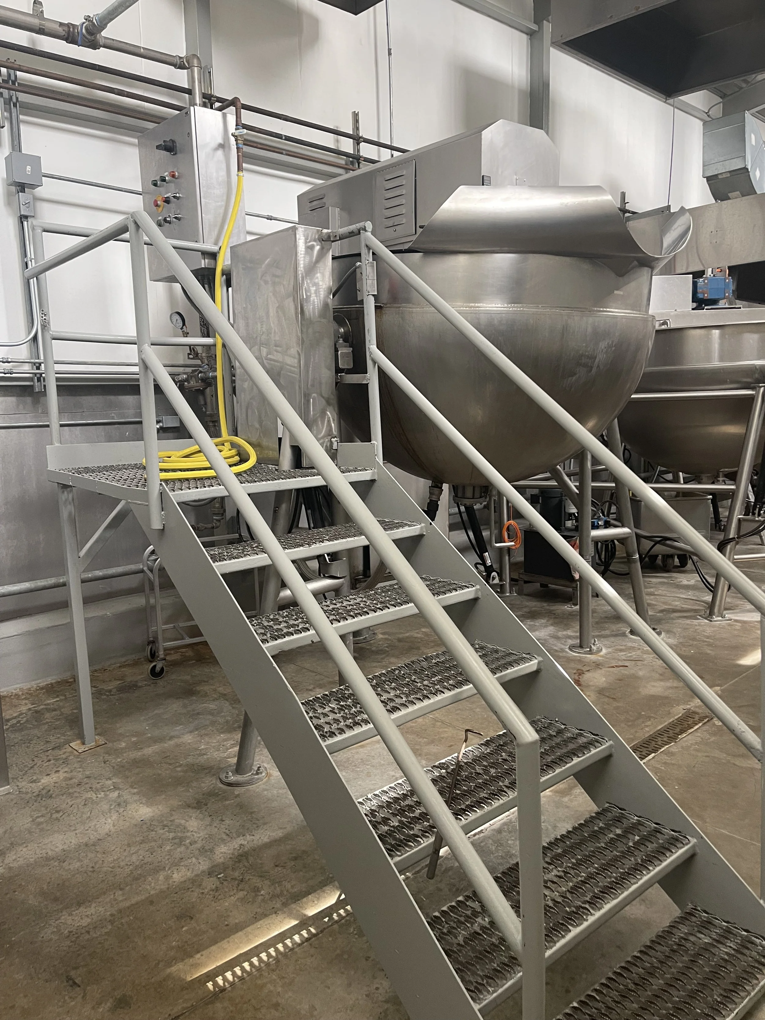 The unit is configured as a platform-mounted system with operator access stairs and integrated controls, supporting safe and controlled operation at industrial production scale. This type of system is commonly utilized in high-volume food processing operations for preparation of sauces, fillings, soups, and prepared meal components.