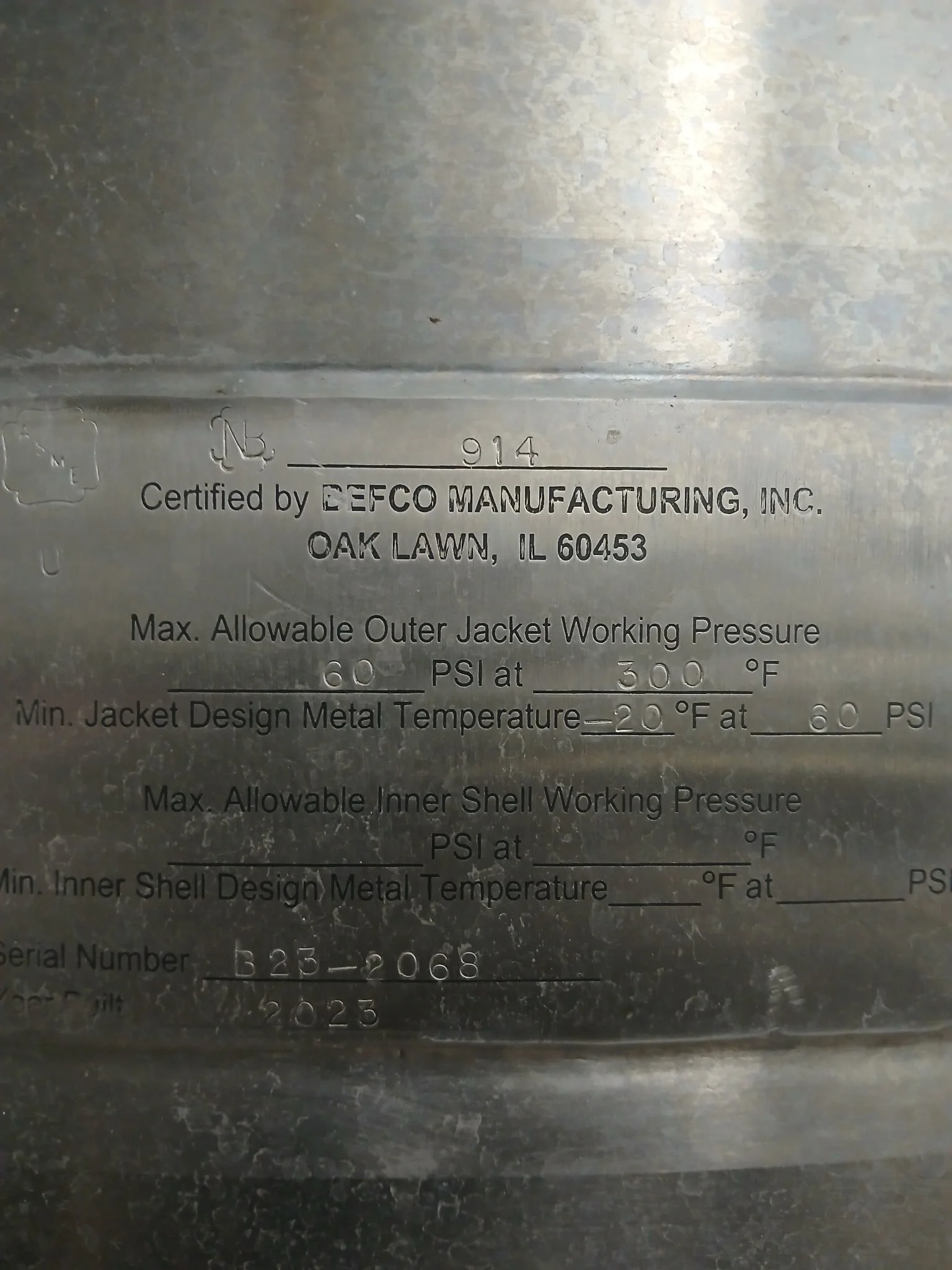 Unit observed installed within kettle room and configured for production use. Manufacturer nameplate verified confirming DEFCO Manufacturing, Inc., serial number B23-2068, and pressure vessel ratings. National Board registration present (NB 914). Equipment appears complete with vessel, agitation drive, hydraulic tilt system, and control interface. Overall condition consistent with maintained industrial food processing equipment in active service.