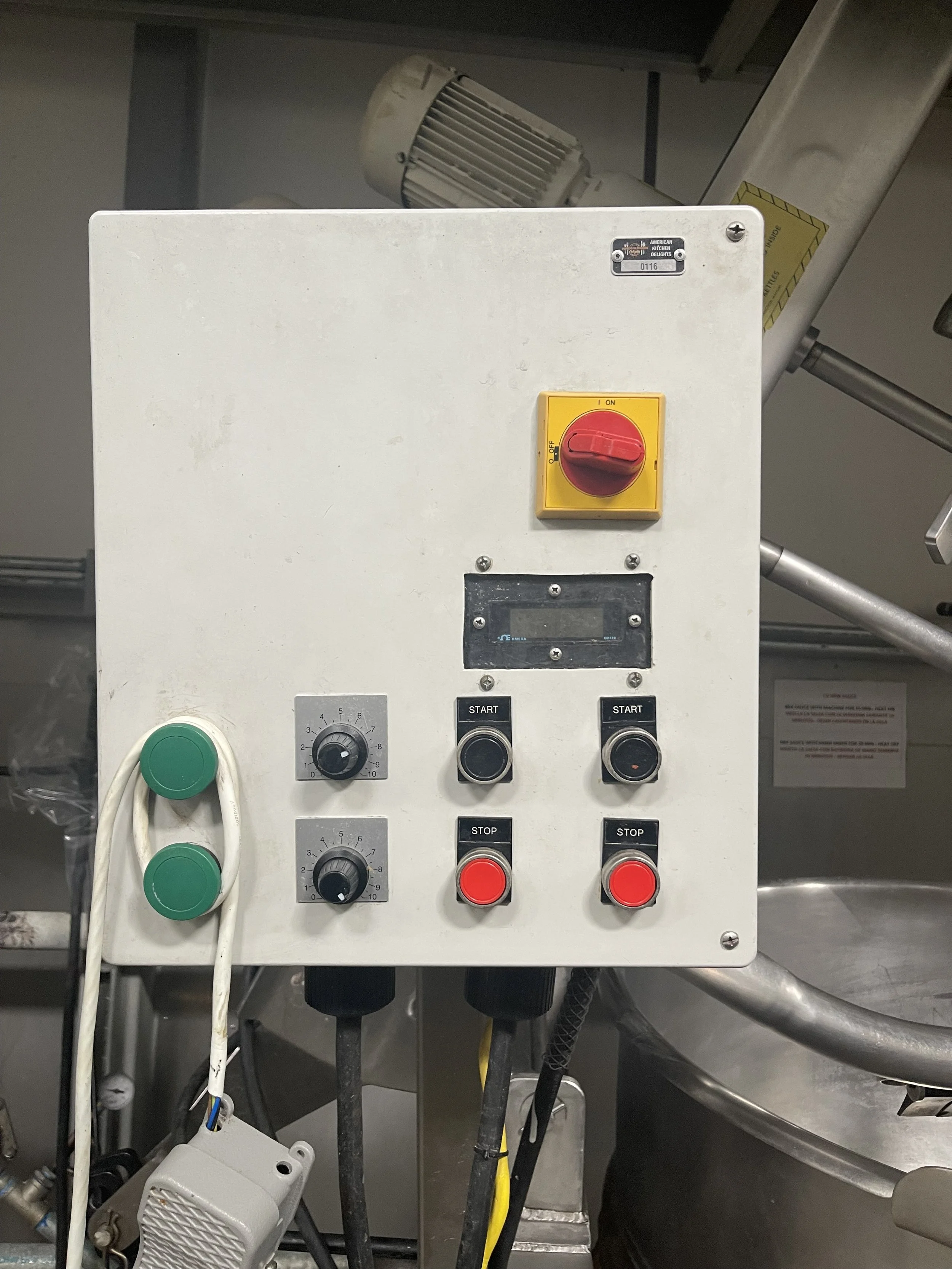 Unit observed installed within kettle room and configured for production use. Equipment appears complete with vessel, dual-drive agitation system, hydraulic tilt mechanism, and integrated control panel. No manufacturer nameplate observed at time of documentation. Configuration is consistent with industrial steam-jacketed agitated kettles used in commercial food processing. Overall condition consistent with maintained production equipment.