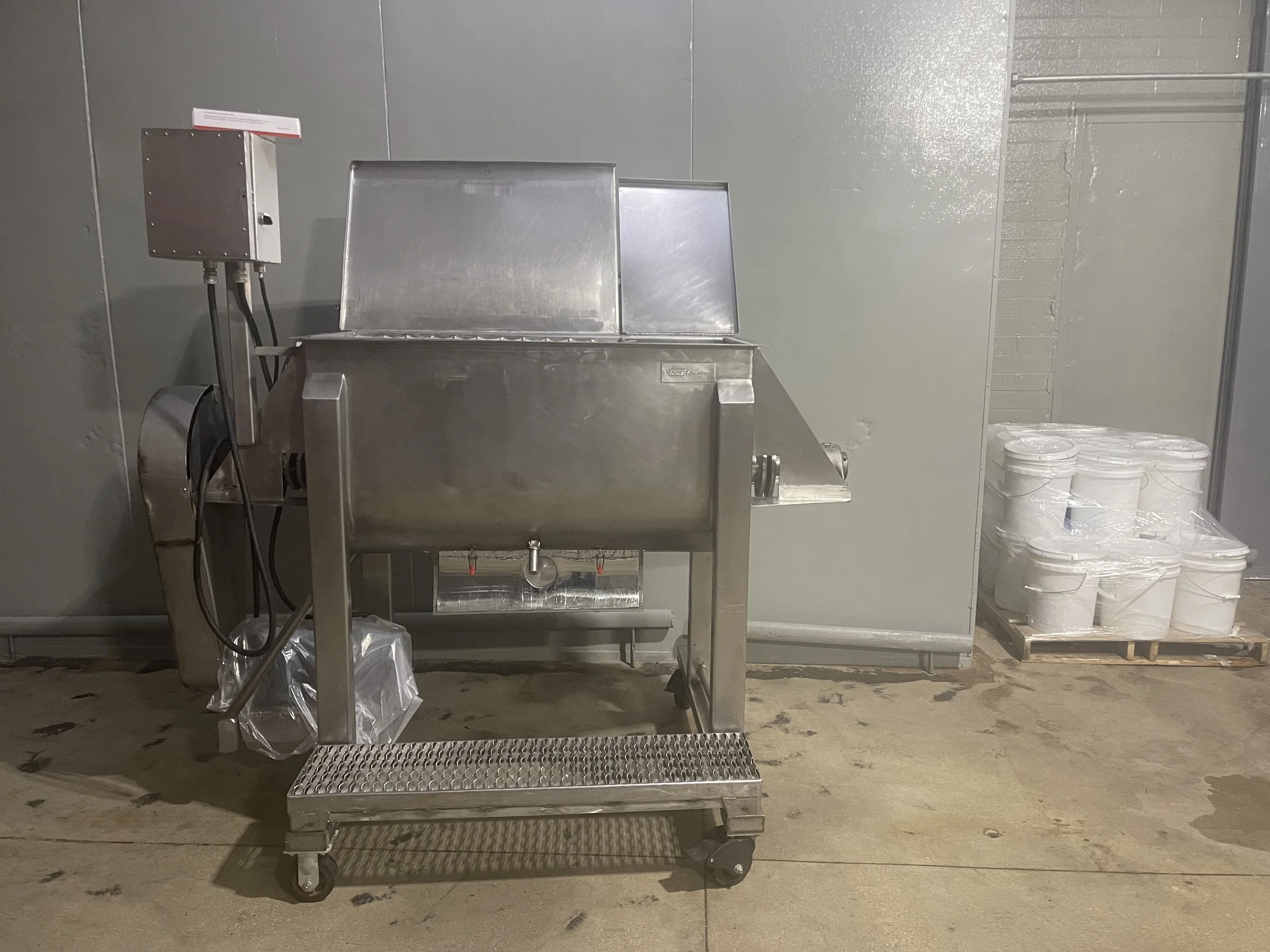 This asset is a stainless steel horizontal ribbon mixer featuring an approximate 21-inch by 48-inch mixing trough, configured for medium-scale batch production. The unit is installed, fully operational, and actively used within AKDI’s production environment.
