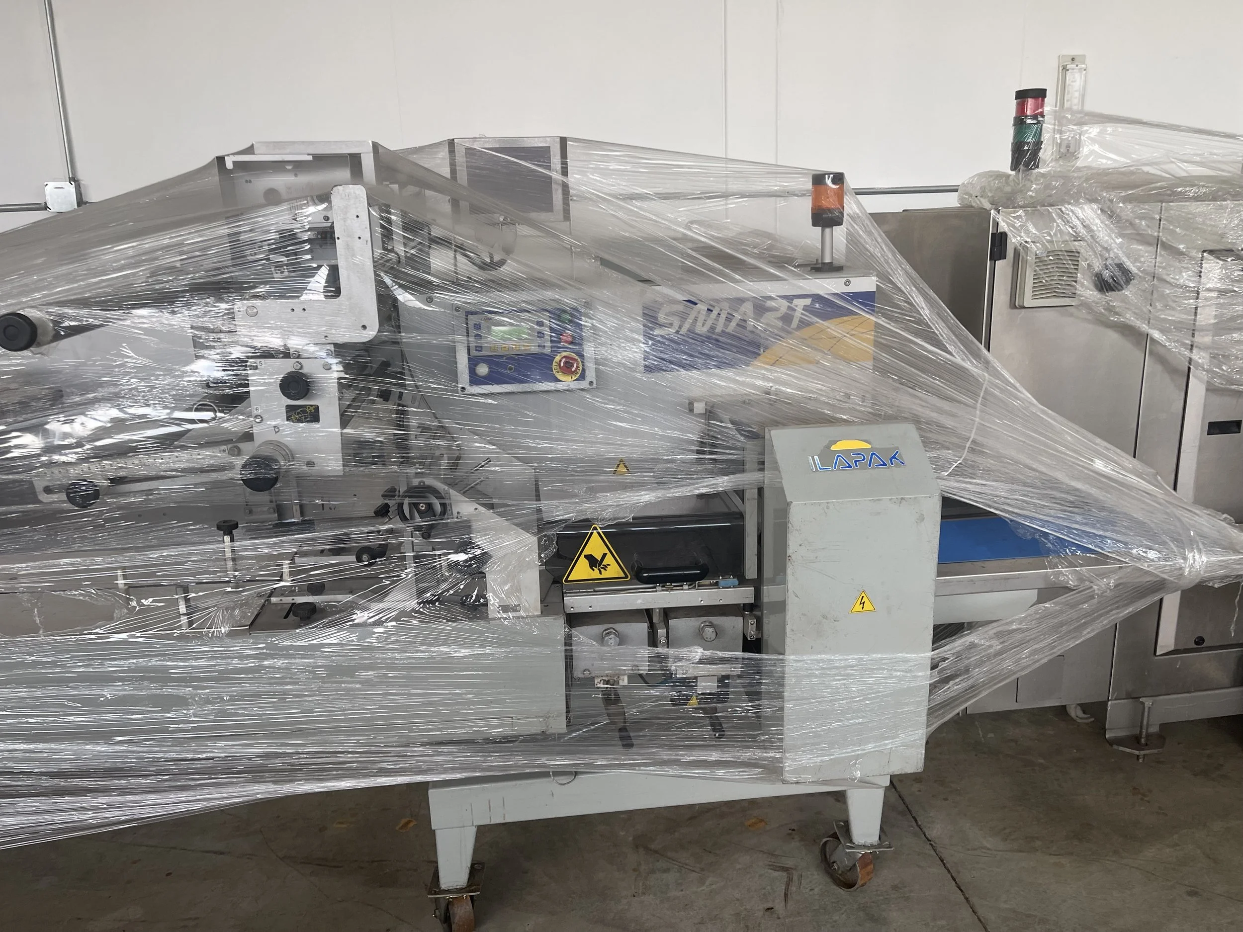 The ILAPAK SMART is a horizontal form-fill-seal (HFFS) flow wrapping machine designed for continuous packaging of food and non-food products in flexible film. The system integrates product infeed, film forming, sealing, and discharge into a single automated platform, enabling consistent and repeatable packaging output suitable for mid-volume production environments.