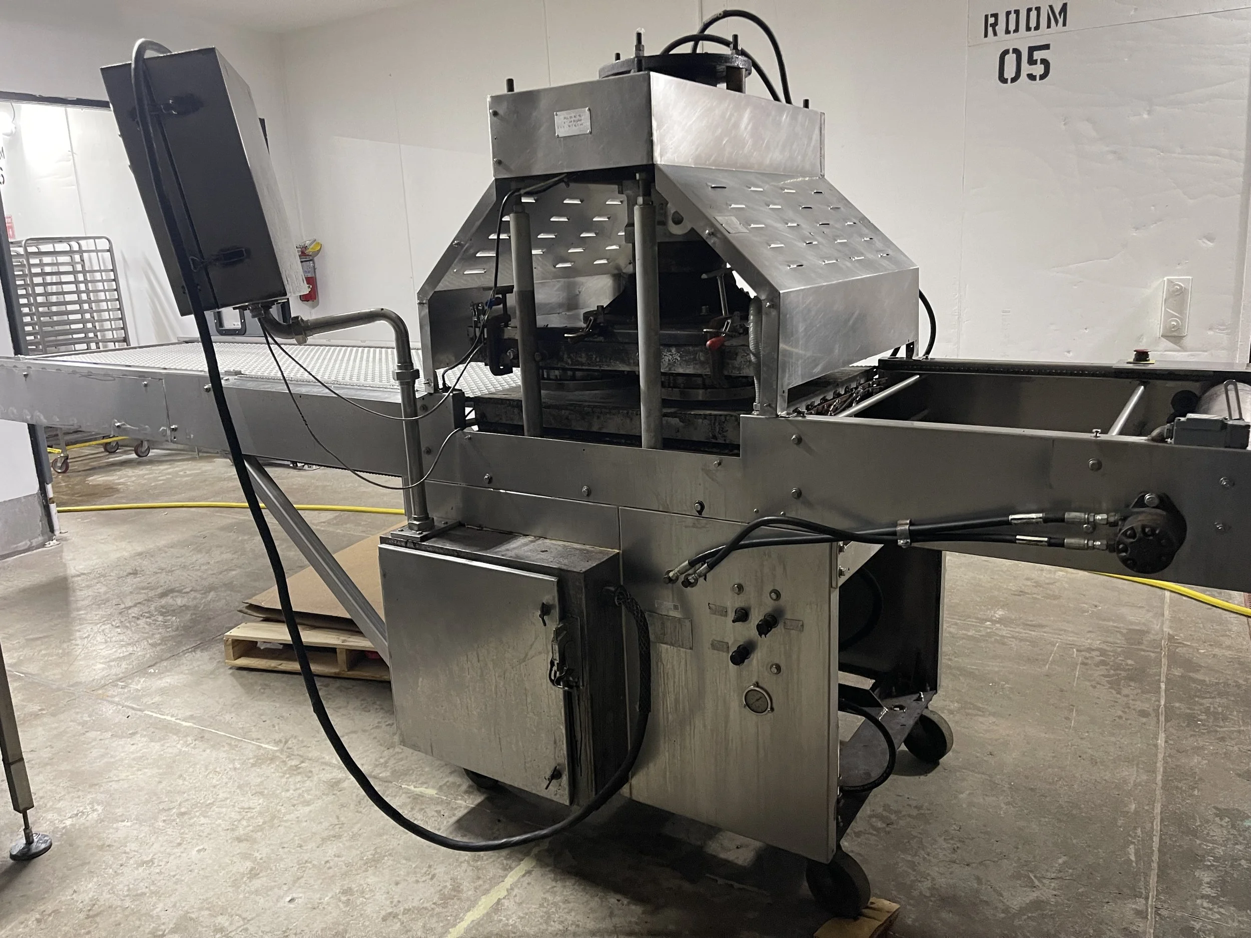 Manufacturer identification is not clearly legible on the unit; however, the system is consistent with industrial dual platen contact cookers used in commercial food production environments.