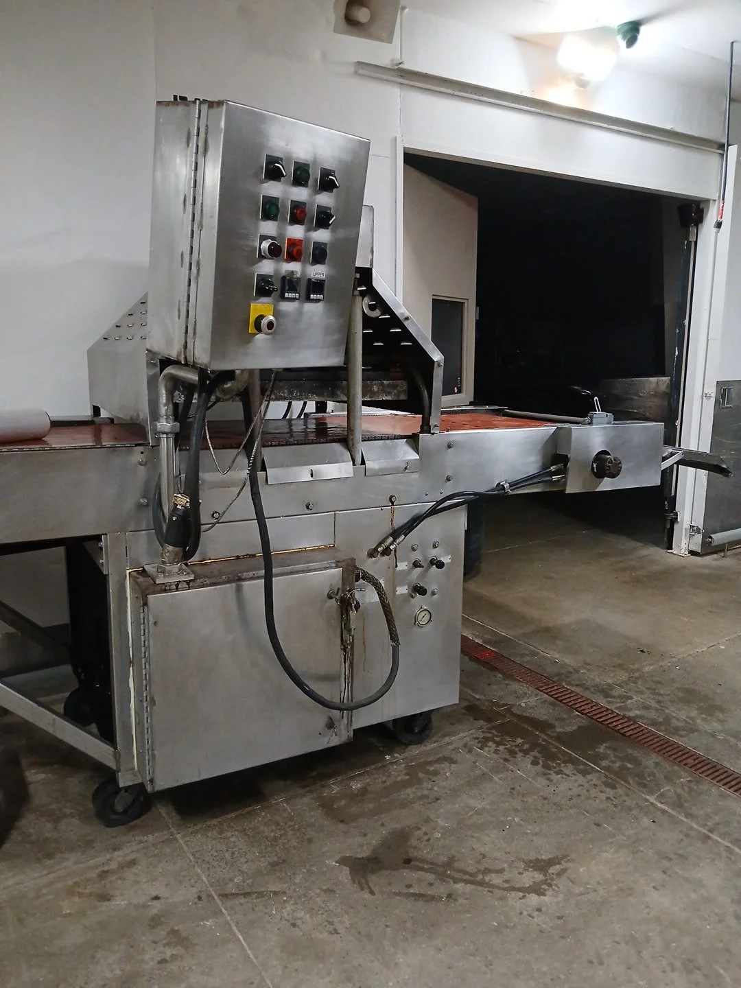 Configured with integrated conveyor system, heated press assembly, adjustable control panel, and stainless steel construction as part of the installed processing line.