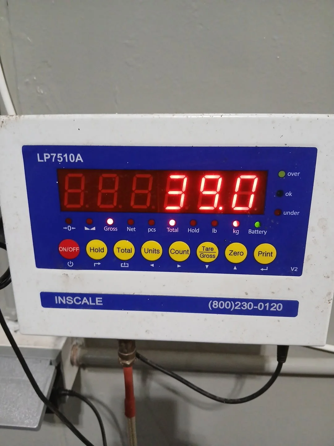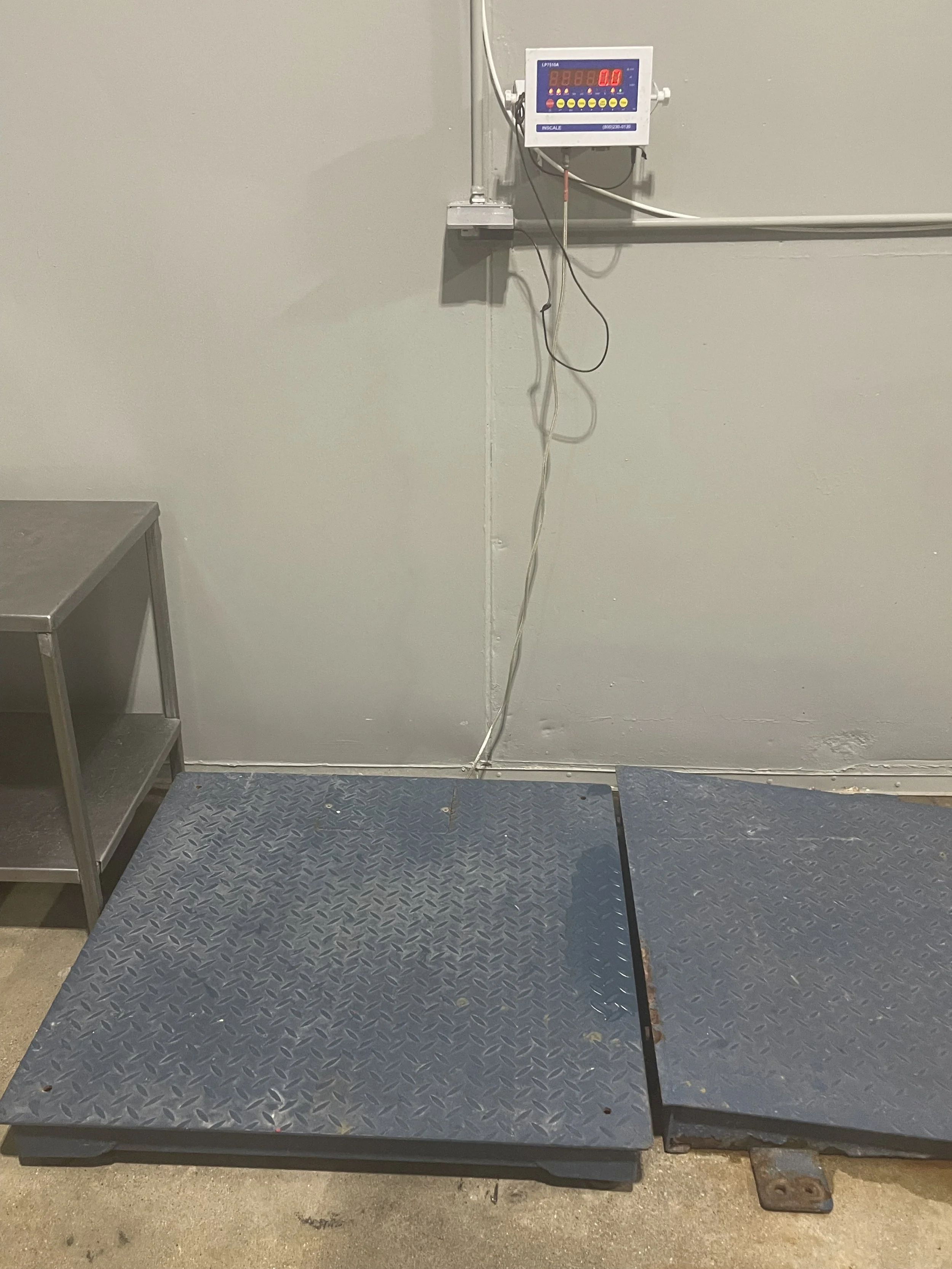 This asset consists of a dual-platform floor scale system integrated with a wall-mounted digital indicator (LP7510A). The system is installed and actively used within AKDI’s production environment for weighing materials and verifying batch quantities.
