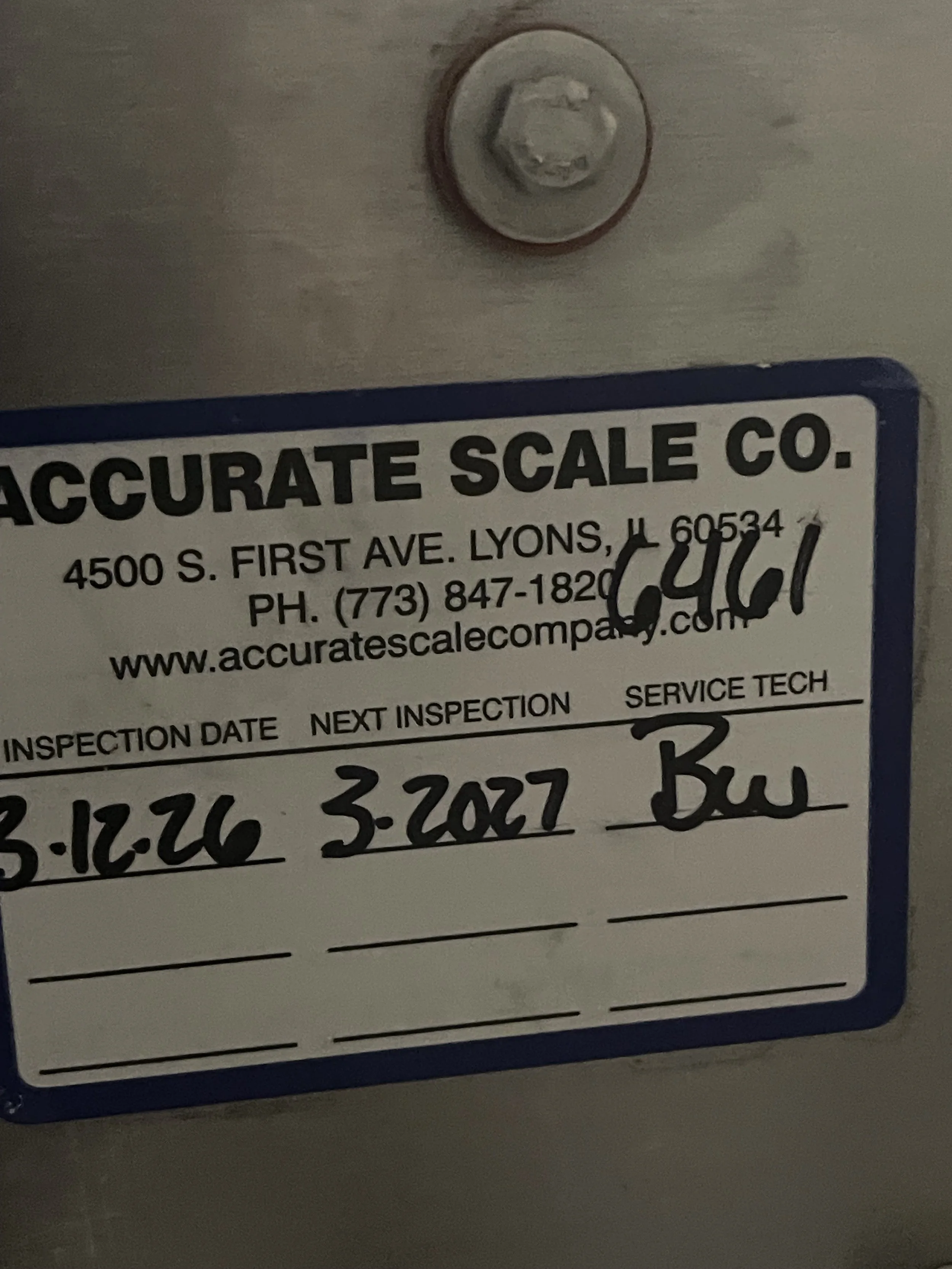 Recent third-party inspection (Accurate Scale Co.) confirms calibration and service status.
