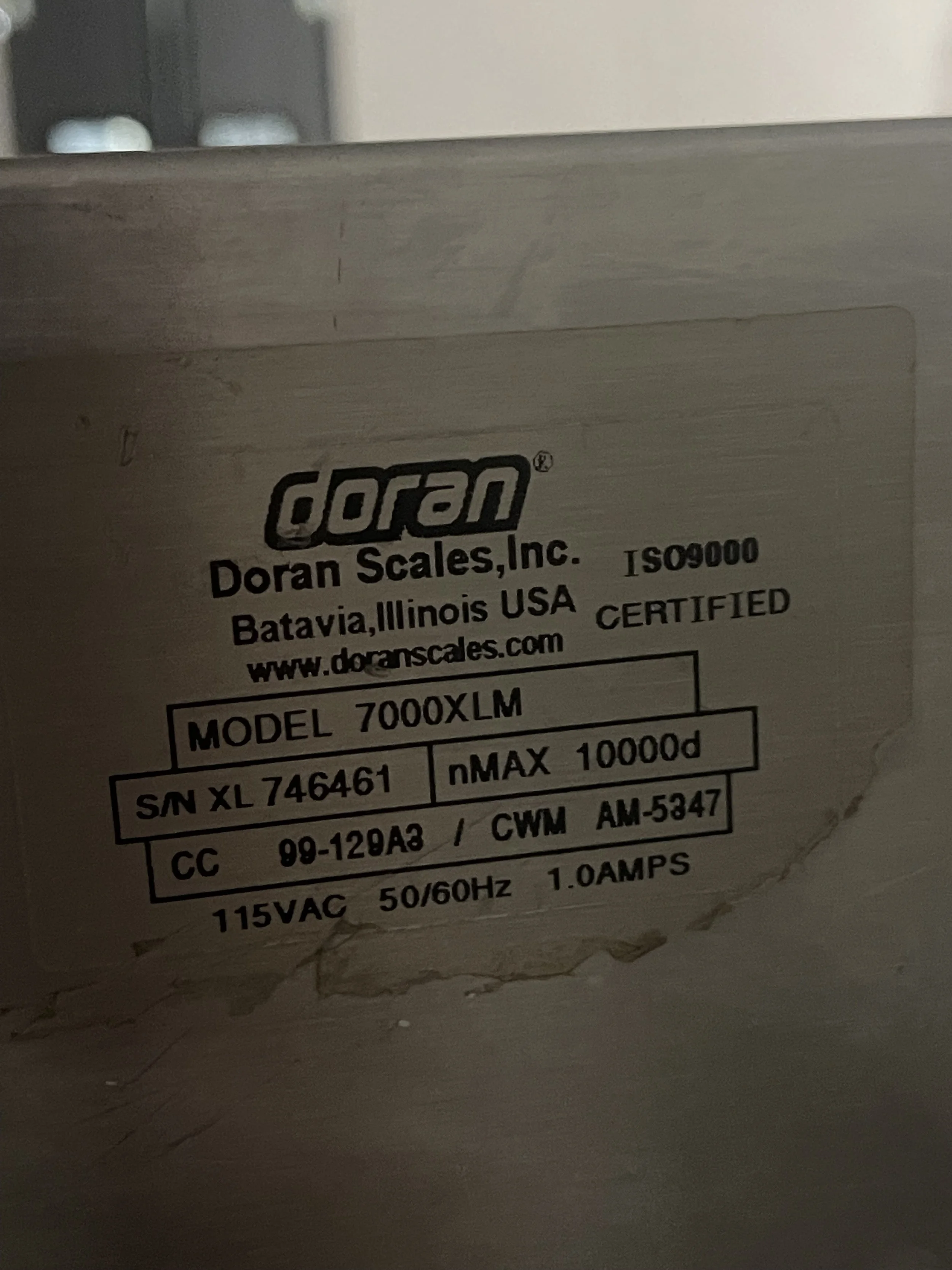 Verification confirms the presence, manufacturer identification (Doran Scales, Inc.), model (7000XLM), serial number (XL 746461), and operational status of the unit.