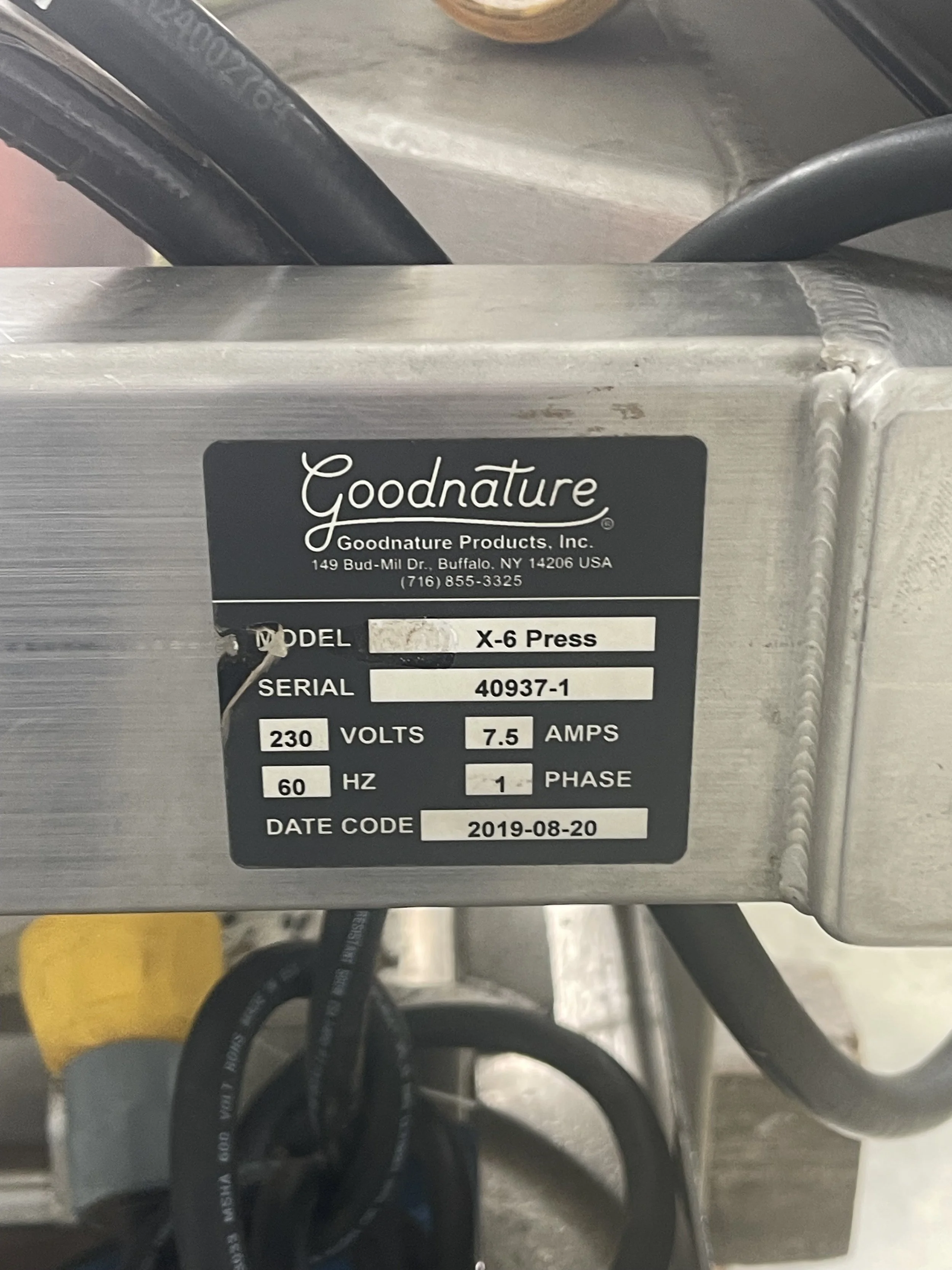 The Goodnature X-6 system serves as the primary juice extraction asset within the facility’s beverage production workflow. The integrated grinder and hydraulic press combination allows the system to process raw fruit, vegetables, botanicals, and other ingredients into finished juice products through a continuous workflow.